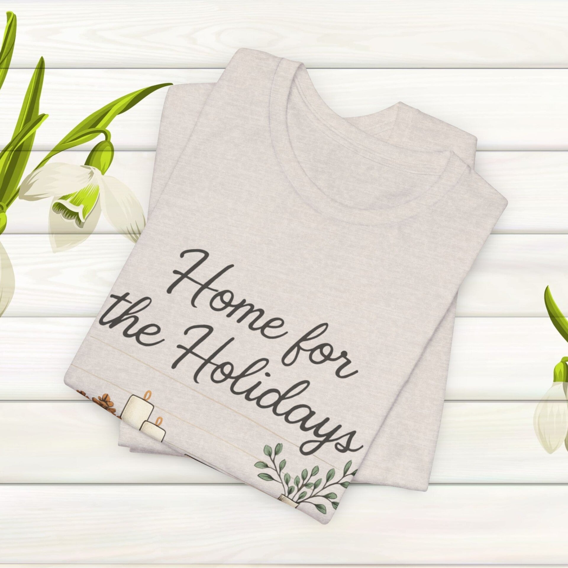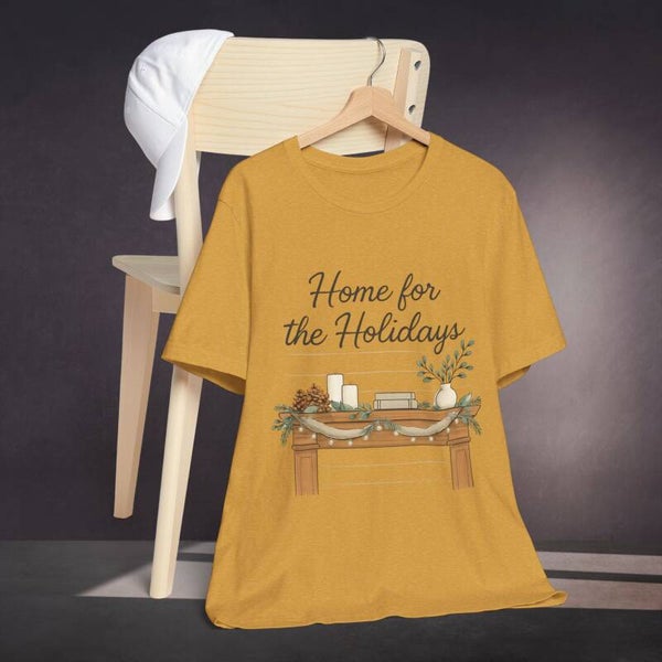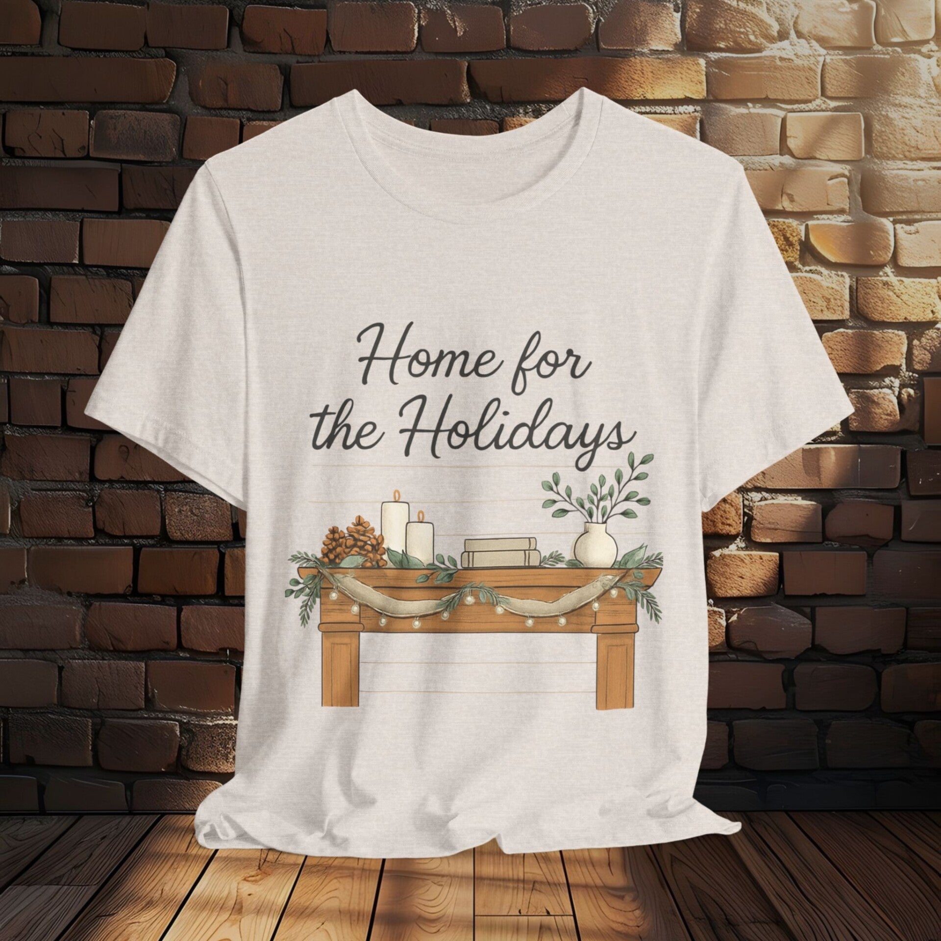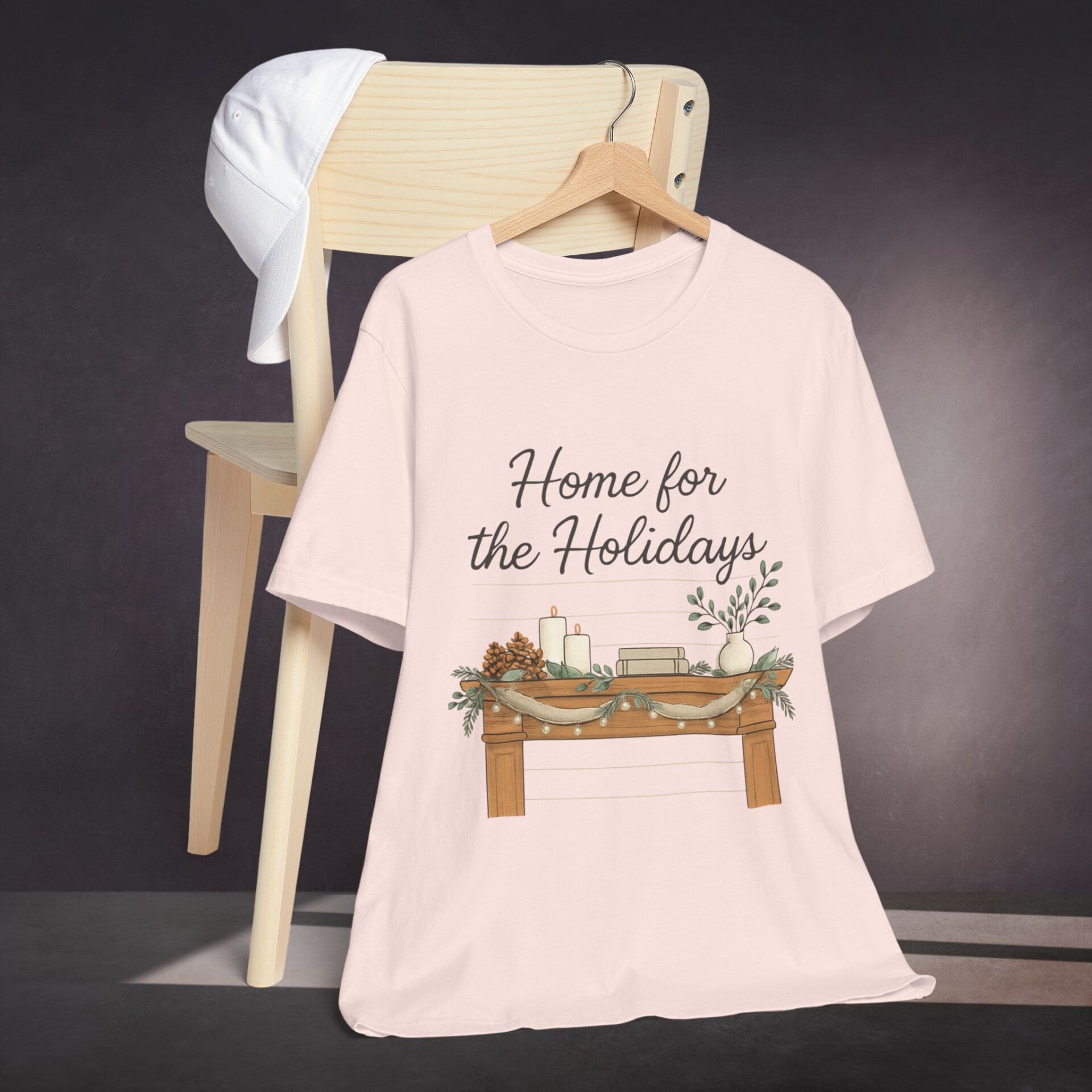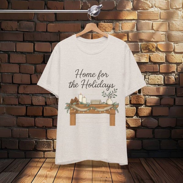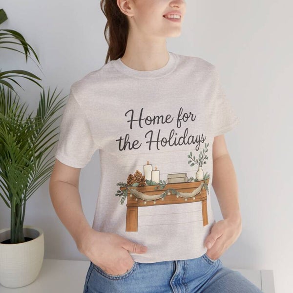 Soft, breathable tee with a warm, homey illustration: a wooden table styled with candles, greenery, and cozy details beneath the handwritten sentiment “Home for the Holidays.” Lightweight Airlume combed cotton keeps the shirt airy for indoor gatherings or relaxed strolls through town. The retail crew neck and clean silhouette make it easy to layer under a cardigan or wear on its own during holiday meals and low-key celebrations. Subtle vintage tones in the artwork create a calm, nostalgic atmosphere — the kind that brings friends and family together around simple rituals and the glow of candlelight. Product features - 100% Airlume combed ring-spun cotton — lightweight and breathable (Bella+Canvas 3001) - Retail fit with crew neckline for a neat, versatile look - Durable side seams, ribbed knit collar, and shoulder tape for shape retention - Tear-away neck label and REACH certified materials; adult sizing - High-detail sleeve and label printing options (DTF/DTG) and ethically manufactured Care instructions - Machine wash: cold (max 30C or 90F) - Non-chlorine: bleach as needed - Tumble dry: low heat - Iron, steam or dry: medium heat - Do not dryclean